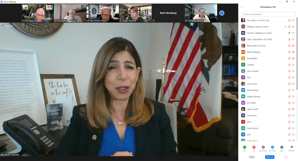 Very sad news today, David Ringrose a long time member of our club died today in his sleep at home. The club used recognition points to give him his 3rd Paul Harris Fellow in his wife’s name. Our annual Chili & Quakers with event Chair Matt Kurth was briefly discussed. Today’s speaker was San Diego District Attorney Summer Stephan talking about Human Trafficking. The random name raffle winner today was Matt Kurth winning a $50 gift card.
