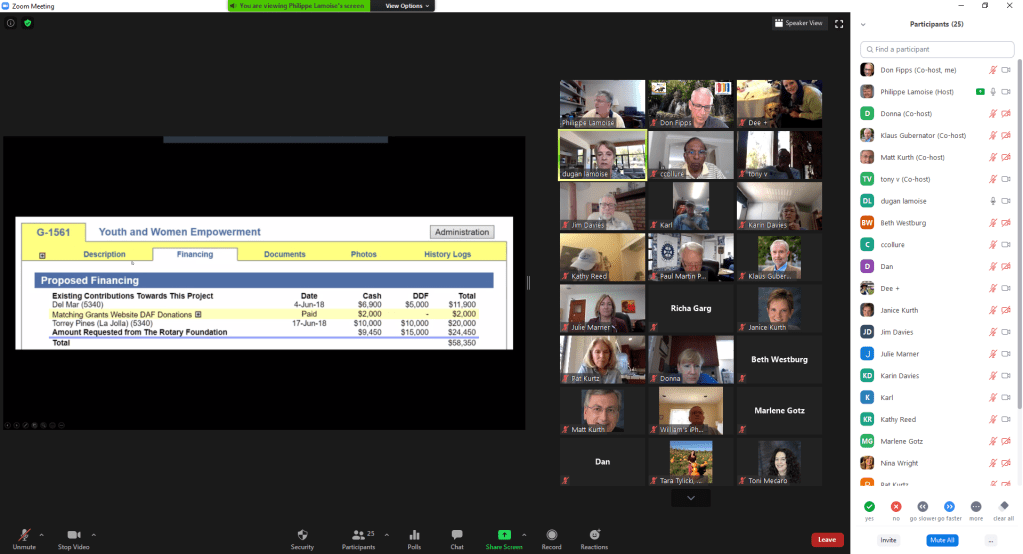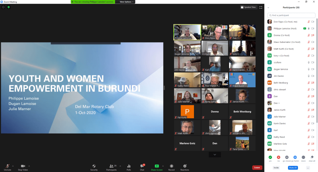 October 1, 2020. Today has been busy with Rotary. It started with the Community Service Committee and then to our regular weekly meeting. Julie Marner, Rotary Club of San Diego and Philippe and Dugan reviewed our global grant project Youth and Women Empowerment in Burundi using microcredit funding. After the club meeting was our Ducky Derby Committee meeting. At the meeting it was announced that our annual event will be at Viewpoint Brewery in Del Mar, Monday October 26, 2020.