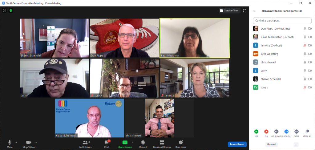 October 22, 2020 – Today began with joining the Youth Service Committee. The committee approved funds for La Colonia and MiraCosta College. We were updated on Sunset High School. There was a discussion about the 4-Way Speech Contest. The Committee Chair asked for volunteers to lead our club’s effort. We heard about how overwhelmed and stressed out the teachers are. Perhaps we should not press forward with the 4-Way Speech this year. Model UN is proceeding to take place in March 2021 via Zoom.