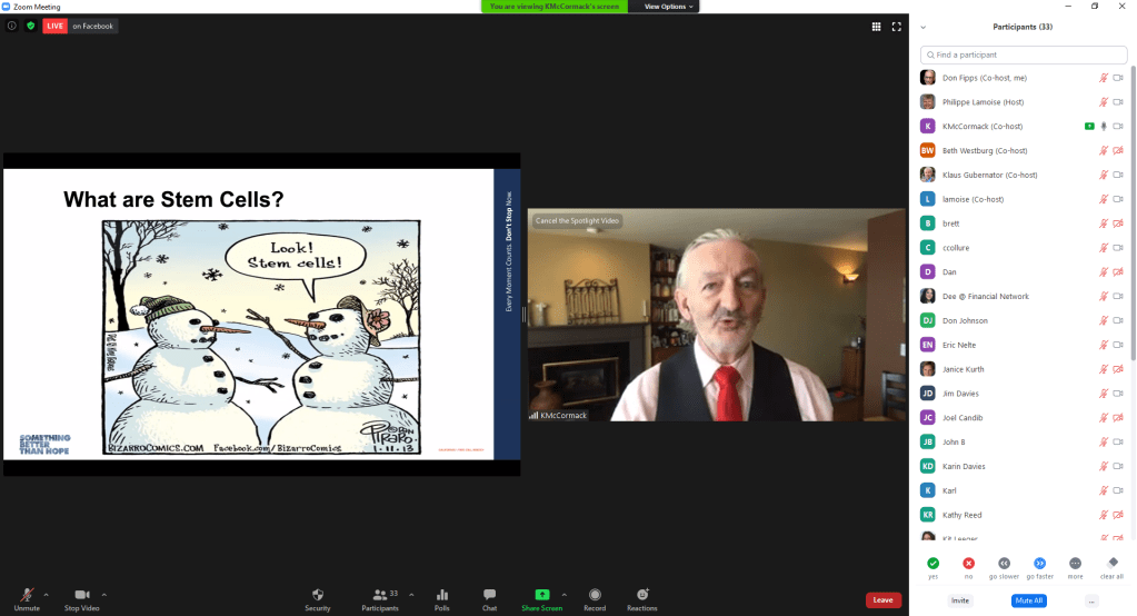 We had 33 on the Zoom call for our regular weekly meeting. During announcements, I encouraged members to donate to Polio Plus https://my.rotary.org/en/donate, and to buy the shoes seen in my background at https://rotary5400.org/page/stomp-out-polio. Today’s guest speaker Kevin McCormack https://www.cirm.ca.gov/about-cirm/contact-us from the California Institute for Regenerative Medicine https://www.cirm.ca.gov/ reviewing it’s mission, research studies and funding.