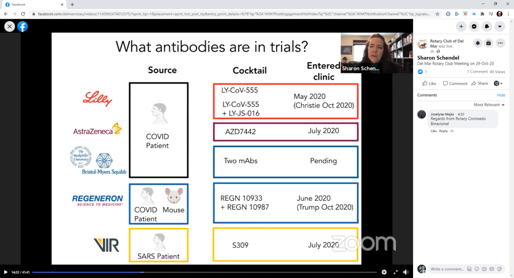 October 29, 2020 – Today my friend, fellow Rotarian and President Elect Sharon Schendel, PhD, was our guest speaker. She talked about her work at the La Jolla Institute for Immunology https://www.lji.org/ working on COVID-19 antibodies. I forgot to take live screen shots during the meeting so I have captured a few from our club’s Facebook Live stream recording. She did an outstanding job describing a complicated process in terms everyone could understand. Congratulations Sharon!