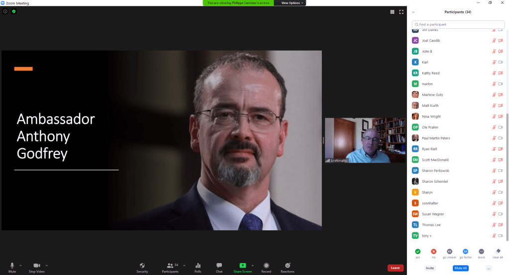 November 12, 2020 – Our weekly meeting included me recognizing Scott MacDoanld with his PHF+1 and Dan Smargon as a Major Donor Level 2. District Governor Steve Weitzen joined our meeting today. Our speaker was Anthony Godfrey Ambassador to the Republic of Serbia. Anthony is a personal friend of Past President Brett Mattei.