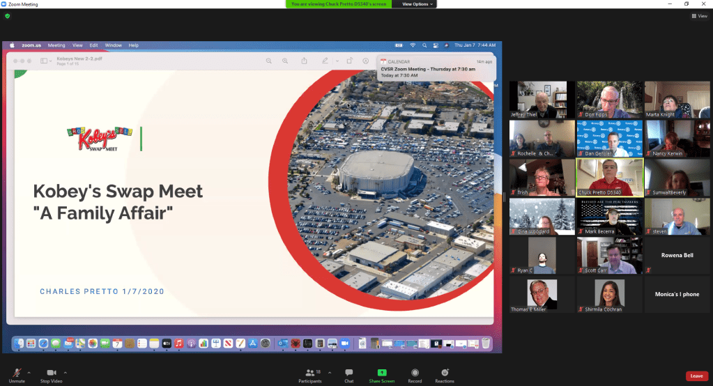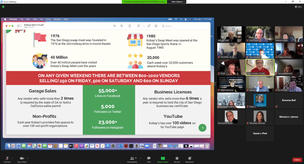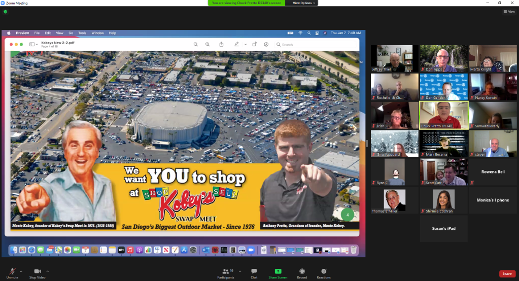 January 7, 2021 – I joined the Rotary Club of Chula Vista Sunrise at 7:30 am to hear Chuck Pretto, District Governor Nominee, talk about Kobey’s Swap Meet.