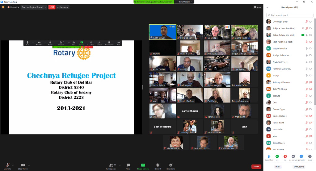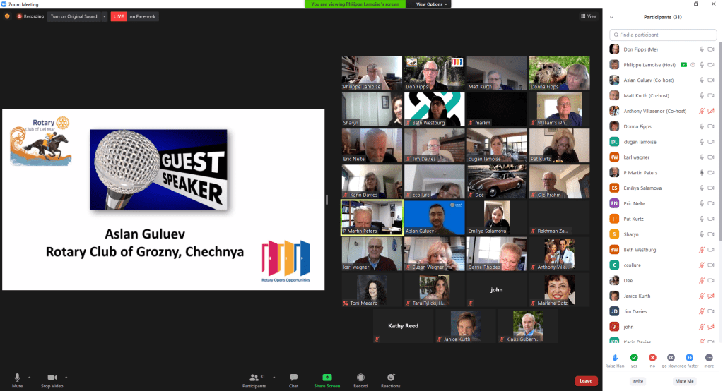 February 4, 2021 – We had a speaker from Grozny, Chechnya, Aslan Guluev speak to the club on the support our club provides them in Chechnya. He was joined by Emiliya Salamova and Rakham Zaburaev.