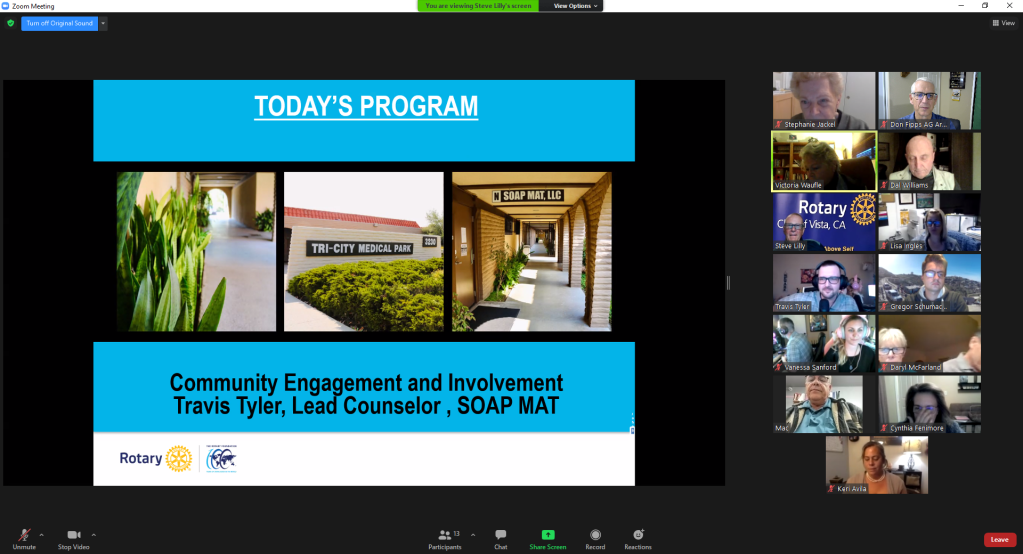 March 9, 2021 – I attended the evening version of the twice monthly meeting of the Rotary Club of Vista as their Assistant Governor. The guest speaker was Travis Tyler, Lead Counselor at SOAP MAT, Stop Opiate Addiction Program LLC. http://www.soapmat.com/