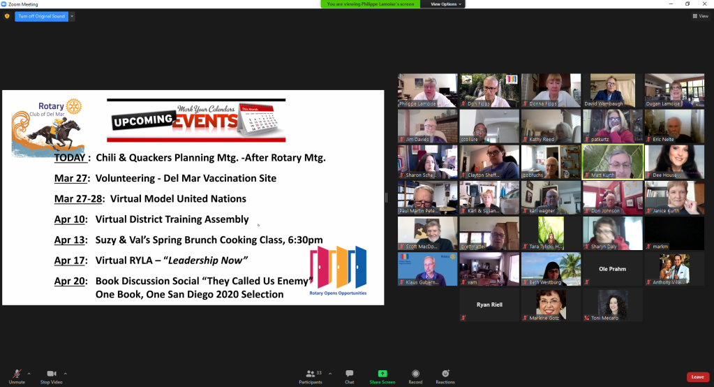 March 18, 2021 – The weekly meeting for the Rotary Club of Del Mar started off with a 15 min social breakout room.