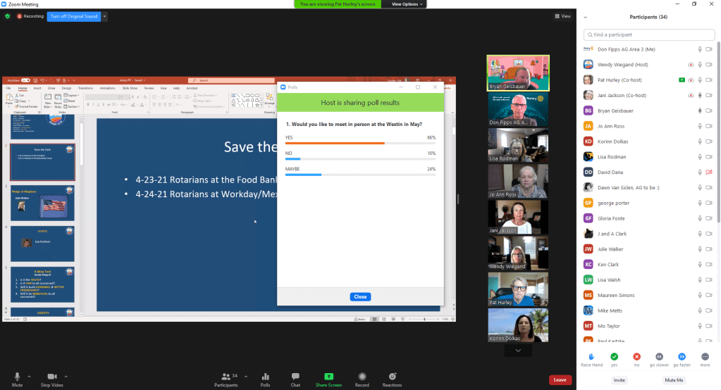 April 12, 2021 – I attended the weekly meeting of the Rotary Club Carlsbad Hi-Noon at the Assistant Governor. I was joined by incoming Assistant Governor Dawn Van Siclen. President Pat Hurley.