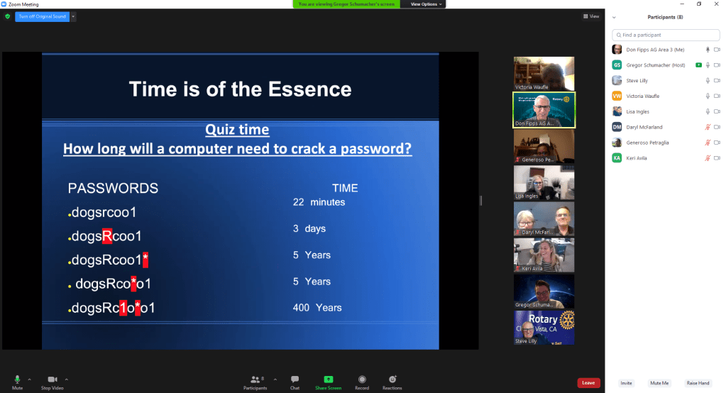 April 13, 2021 – I attended the Rotary Club of Vista evening meeting; the 2nd meeting of the month as their Assistant Governor. This club is number 3 of the 61 clubs in District 5340 in giving to the Annual Fund of The Rotary Foundation.