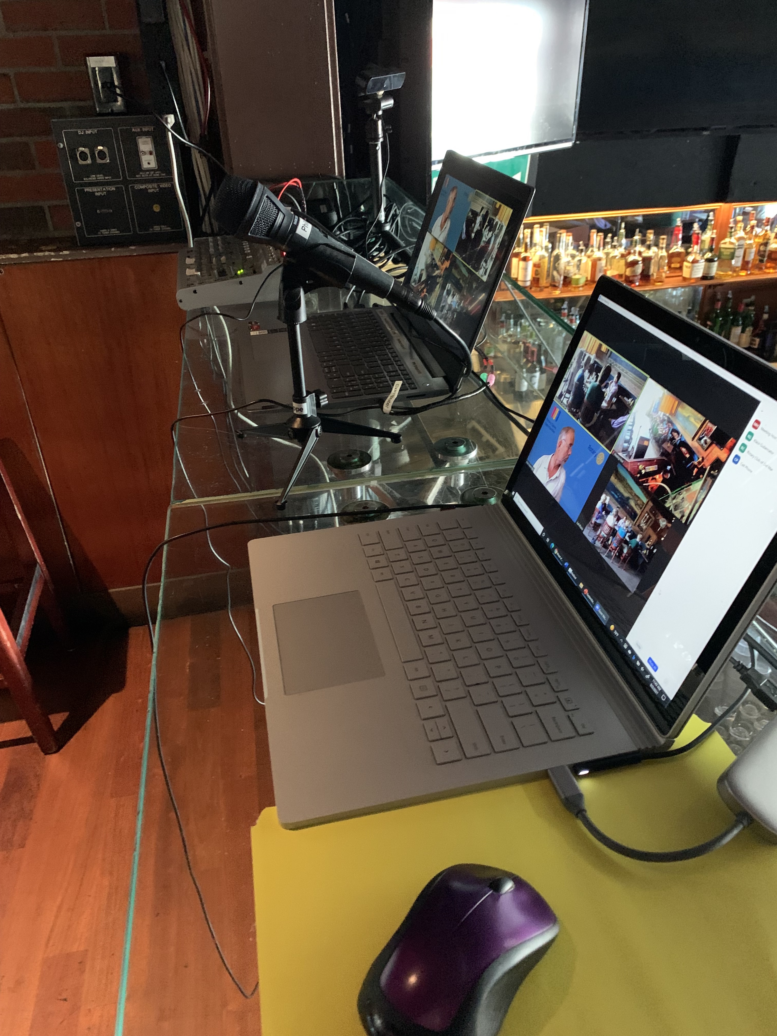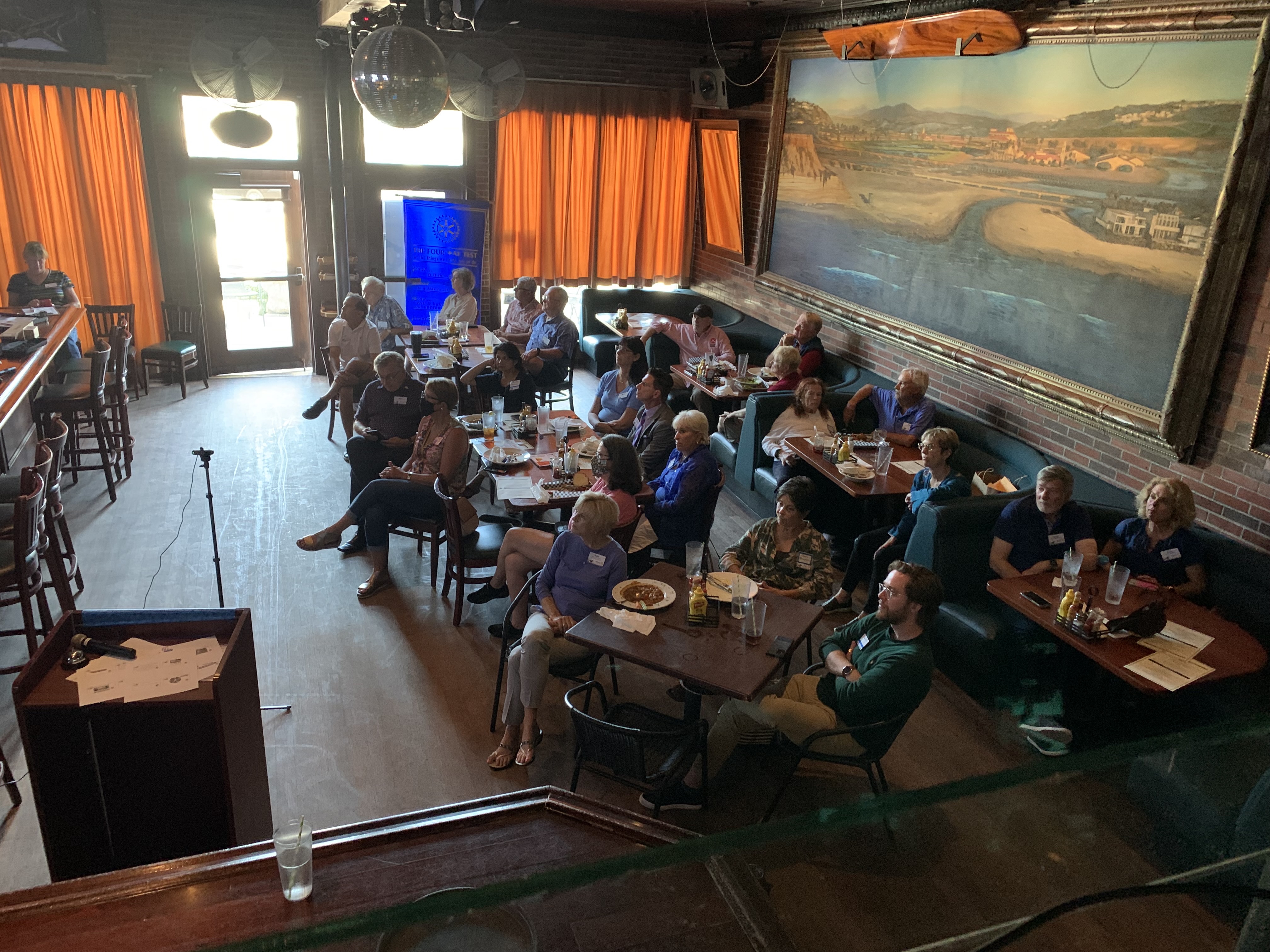September 2, 2021 – The club met again at Jimmy O’s. We used the the inhouse speaker system eliminating the need to move Philipp’s speaker. The sound system work pretty well. We also learned that Jimmy O’s has a storage room where we stored the microphones, sound board, name badge case, flags and pop-up. As Co-president Karl noted, this just keeps on getting better.
