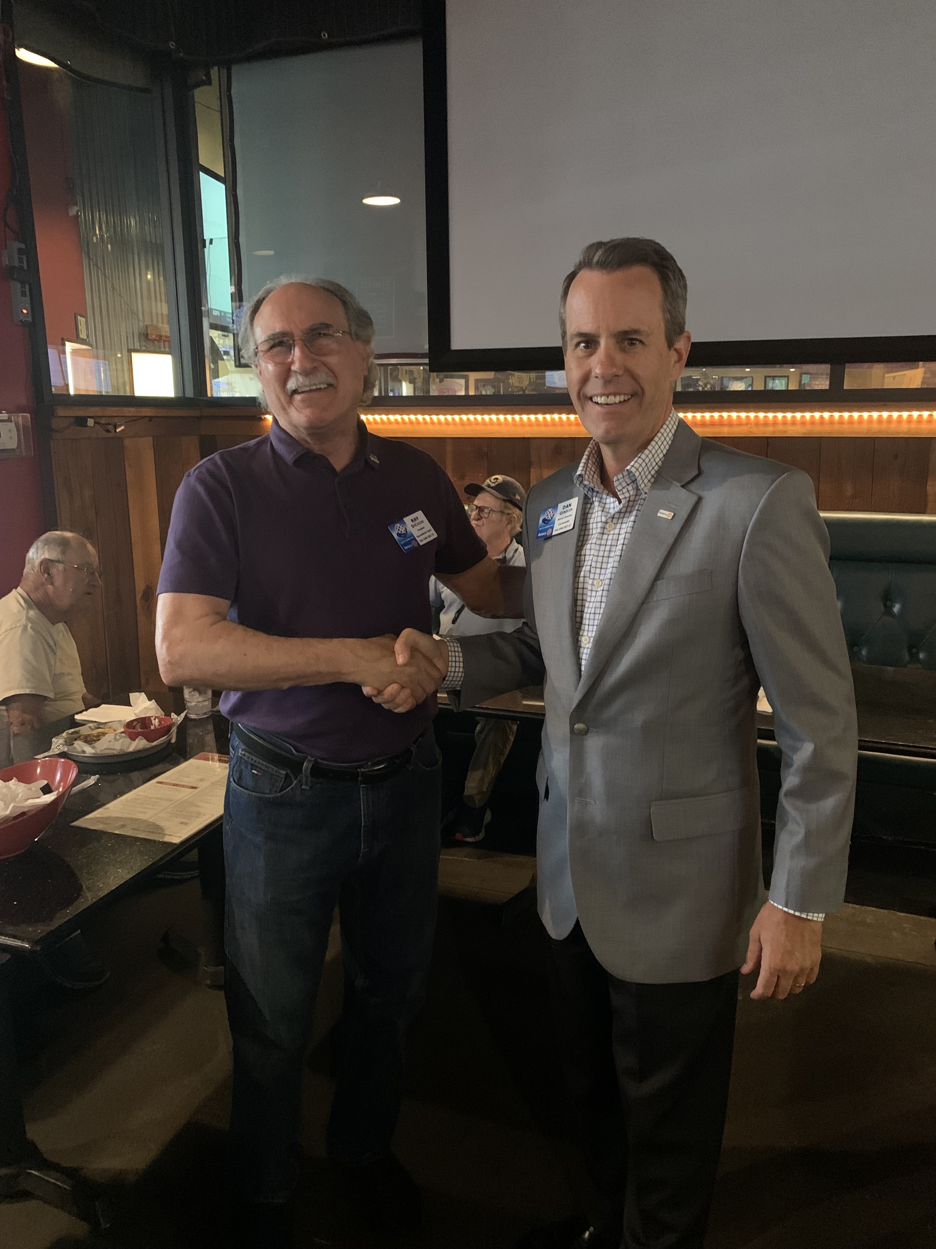 September 17, 2021 – I joined the club for lunch at Mike’s BBQ in Escondido for the official visit of District Governor Dan Gensler. The club normally uses a private room to conduct their meeting. On this occasion, the room was given to another group leaving the Rotary club to meet in an open area in the restaurant with overhead music and no AV support. The meeting space took rearranging of some furniture, it worked!