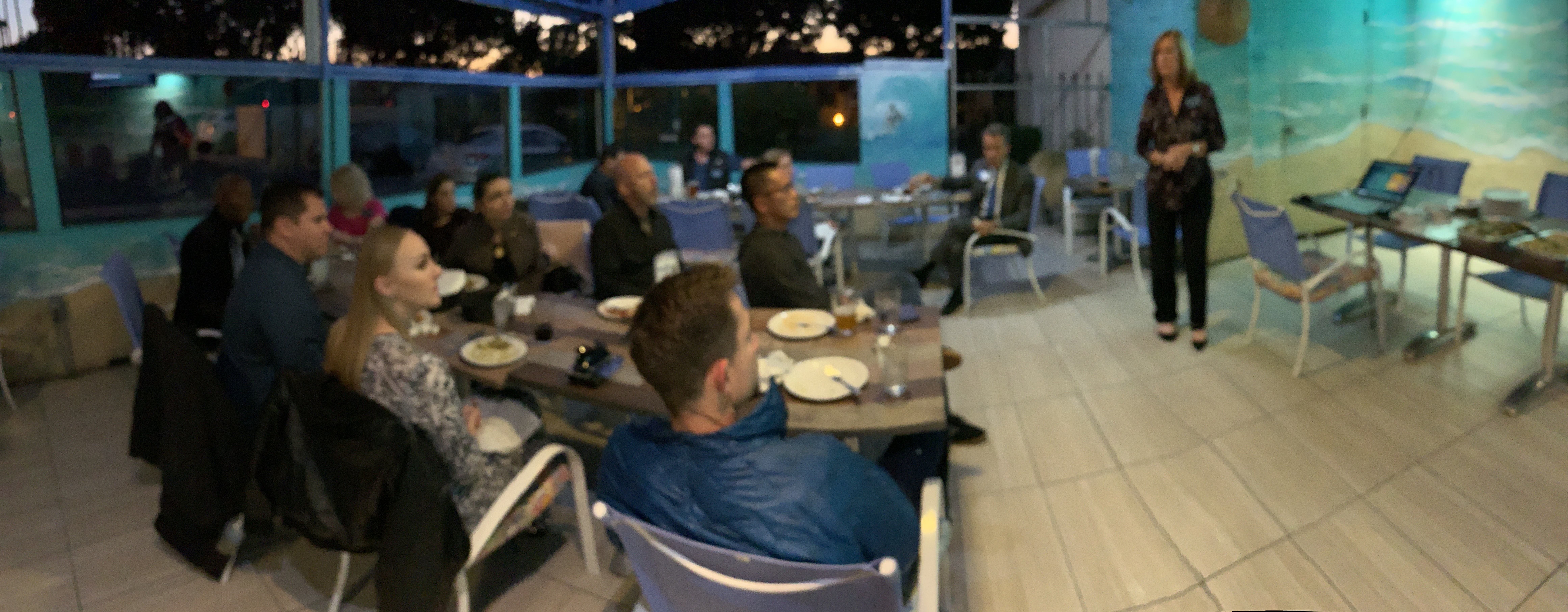 The interesting thing about this meeting was the outdoor space normally reserved for the Rotary Club was doubled booked with a Board meeting for a home owner association. Dan was able to hold his talk on his notebook and spoke close to the members so they could hear.