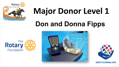 Donna and I were presented by District Governor Dan Gensler as a Major Donor to The Rotary Foundation. This means we have contributed $10,000 to The Rotary Foundation.