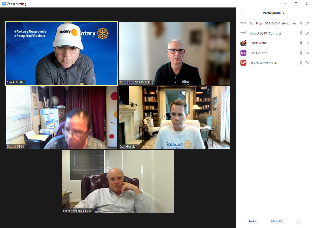 January 3, 2022 – Rotary District 5340 conducted a meeting of the District Leadership Line; immediate past DG (Steve), sitting DG (Dan), DG elect (Chuck), DG nominee (me) and DG designee (Dianne).