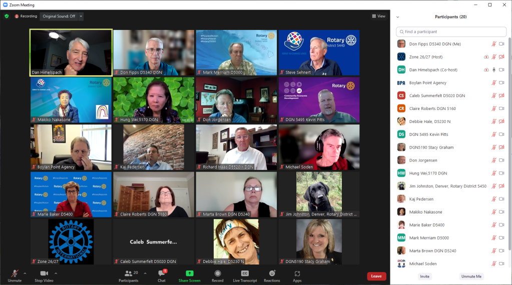 March 16, 2022 – At 5 pm Rotary International Director Elect for Zone 26/27 hosted a Zoom call with the District Governor Nominees, for one 26/27, 30 Districts in all. The meeting was chaired by Dan Himelspach, RID Elect.