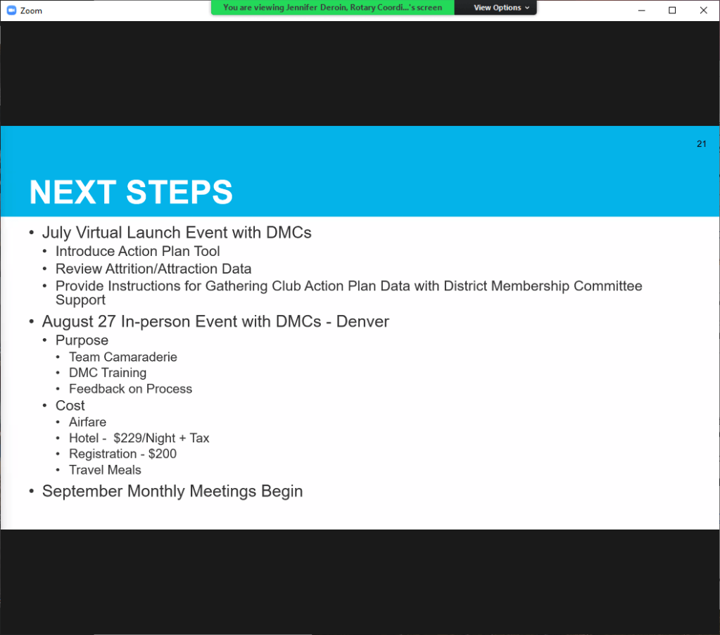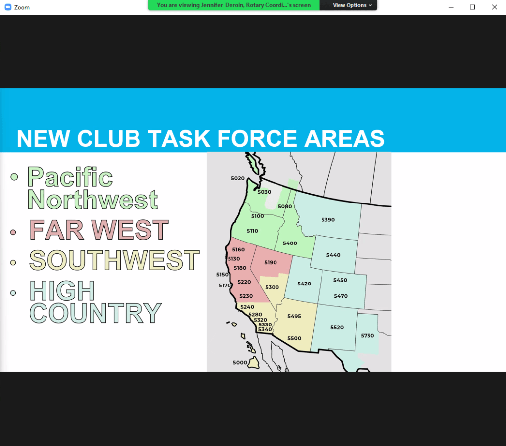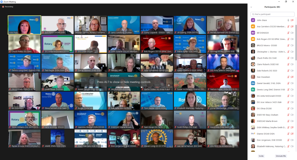 July 7, 2022 – Rotary International Director Vicki Puliz for Zone 26/26 met via Zoom at 5 pm with all District Governors, DG Elects and DG Nominees from the 30 Districts. There were 85 people on the call.