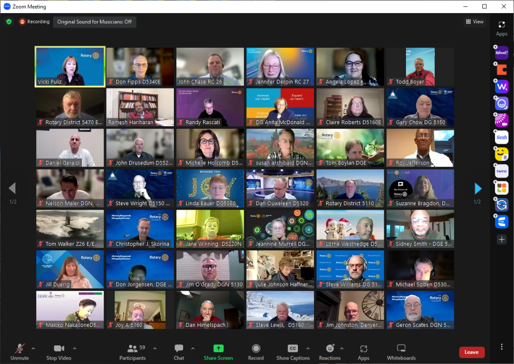 January 5, 2023 – Via Zoom at 5 pm, Rotary International Director Vicki Puliz met with the Big West Zones of 26 and 27 District Governor Line including the District Governor, District Governor Elect, District Governor Nominee and the District Governor Nominee Designate.