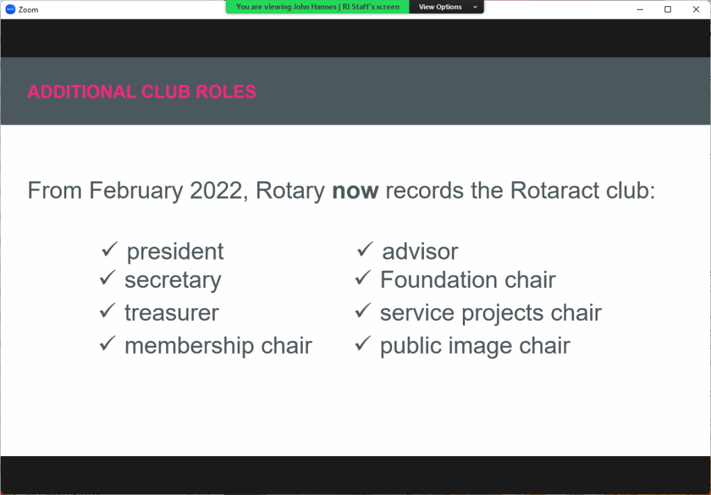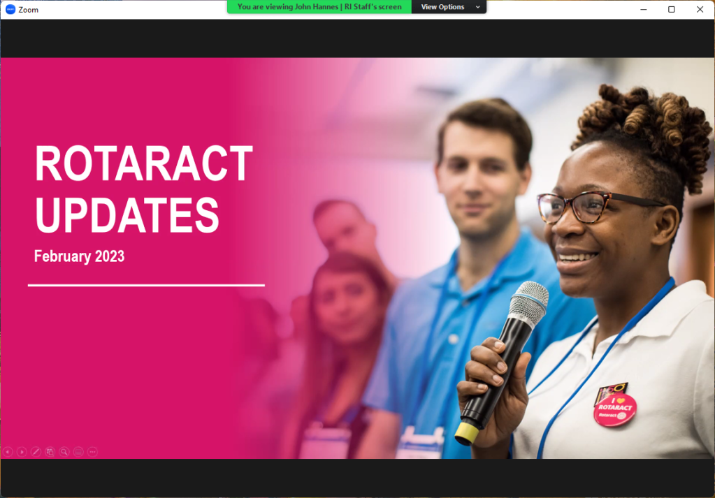 February 21, 2023 – Via Zoom at 5 pm. The Panel was sponsored by Rotary Zone 26 & 27 hosted by Rotary International Director Vicki Puliz. John Hannes, RI Staff for Rotaract was the primary speaker.